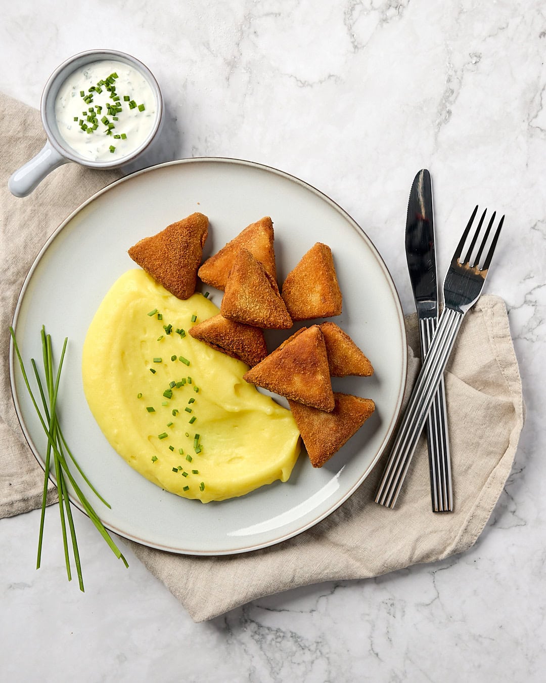 Hotové tofu vyberieme, necháme odkvapkať prebytočný tuk a podávame ho so zemiakovým pyré a dipom.